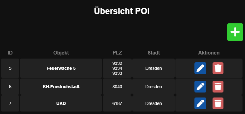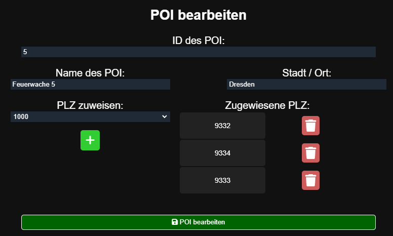 Hier können eine bzw. mehrere PLZ zugewiesen werden. Die oberste PLZ wird dabei stets als PLZ übernommen, wenn das POI in der Leitstelle ausgewählt wird.