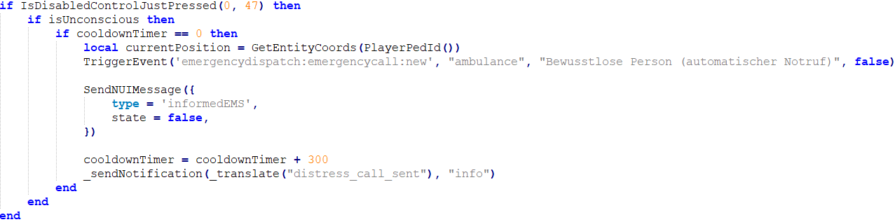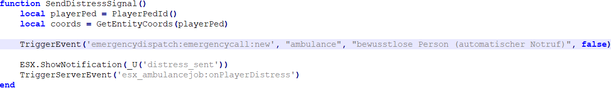 TriggerEvent('emergencydispatch:emergencycall:new', "ambulance", "Bewusstlose Person (automatischer Notruf)", false)