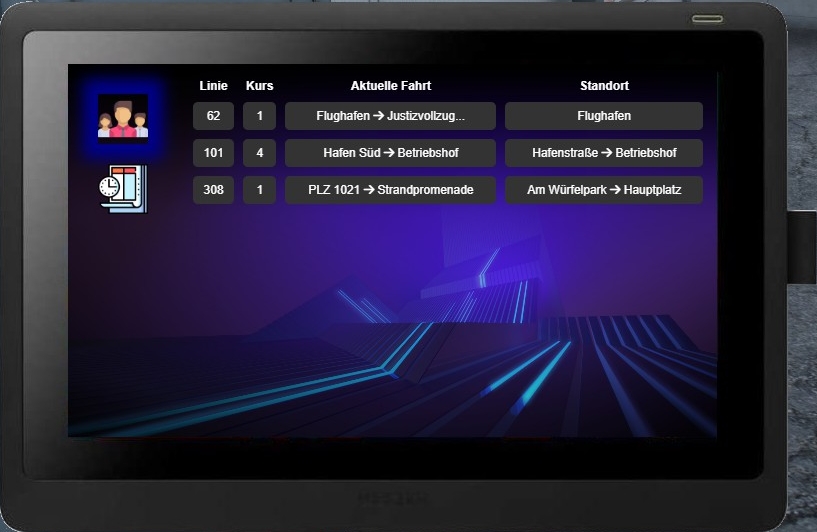 Hier werden alle Fahrzeuge angezeigt, die mit einer Linie und einem Kurs angemeldet sind.