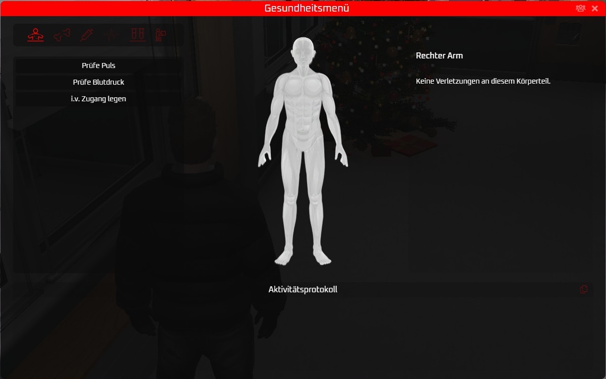 Öffne das Gesundheitsmenü und klicke auf den gewünschten Arm. Wähle hier "i.v. Zugang legen" aus.