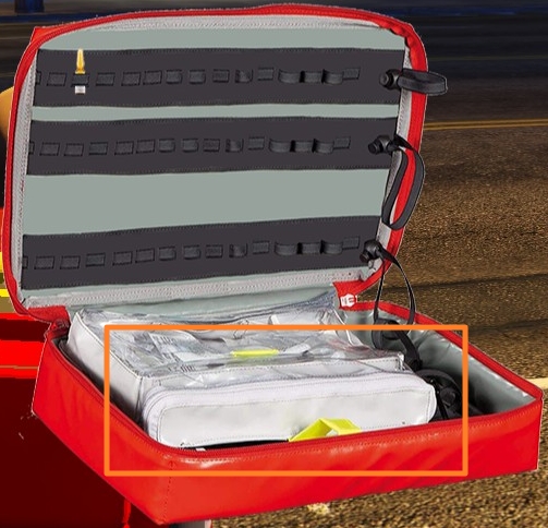 An dem orange markierten (Ablage-) Fläche ist ein Dropdown Menü, mit dem den Notfallwagen unter anderem wieder aufgefüllt werden kann. Dabei werden alle Items aus dem Inventar geprüft und auf dem Notfallwagen verlastet.
