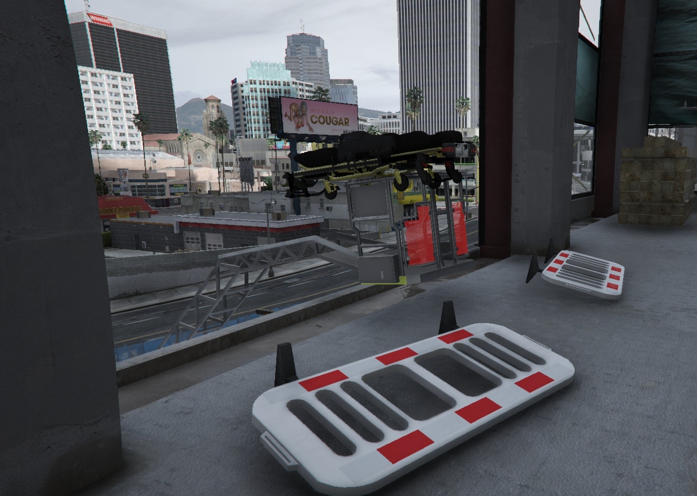 Die Trage kann auf den Körben von Drehleitern montiert werden, um die Rettung aus Höhen bzw. Tiefen zu ermöglichen. Nähere dich dazu mit der Trage dem Korb, um diese zu montieren.