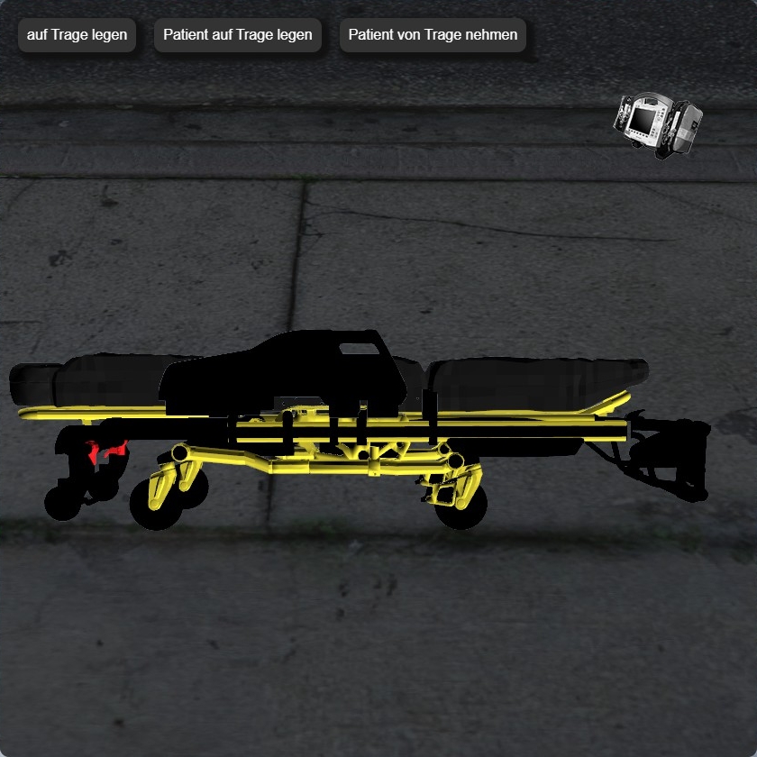 Mit der abgestellten bzw. im RTW verlasteten Trage kann interagiert werden. Hier kann beispielsweise die Lagerung des Patienten eingestellt und der Patient auf die Trage bzw. von der Trage gehoben werden. Die Trage kann "in die Hand genommen" werden, indem auf das Bedienmodul geklickt wird (unter dem Fußteil)\