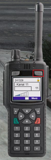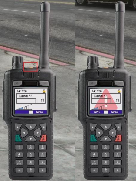 Der Notruf kann mittels der orangenen Taste auf dem Funkgerät (rot eingerahmt) ausgelöst werden. Alle im Funkkanal befindlichen Spieler erhalten die Information über den Notruf und können eine GPS Positon zum Absender einstellen. Der Notruf ist für ca. 30 Sekunden aktiv.