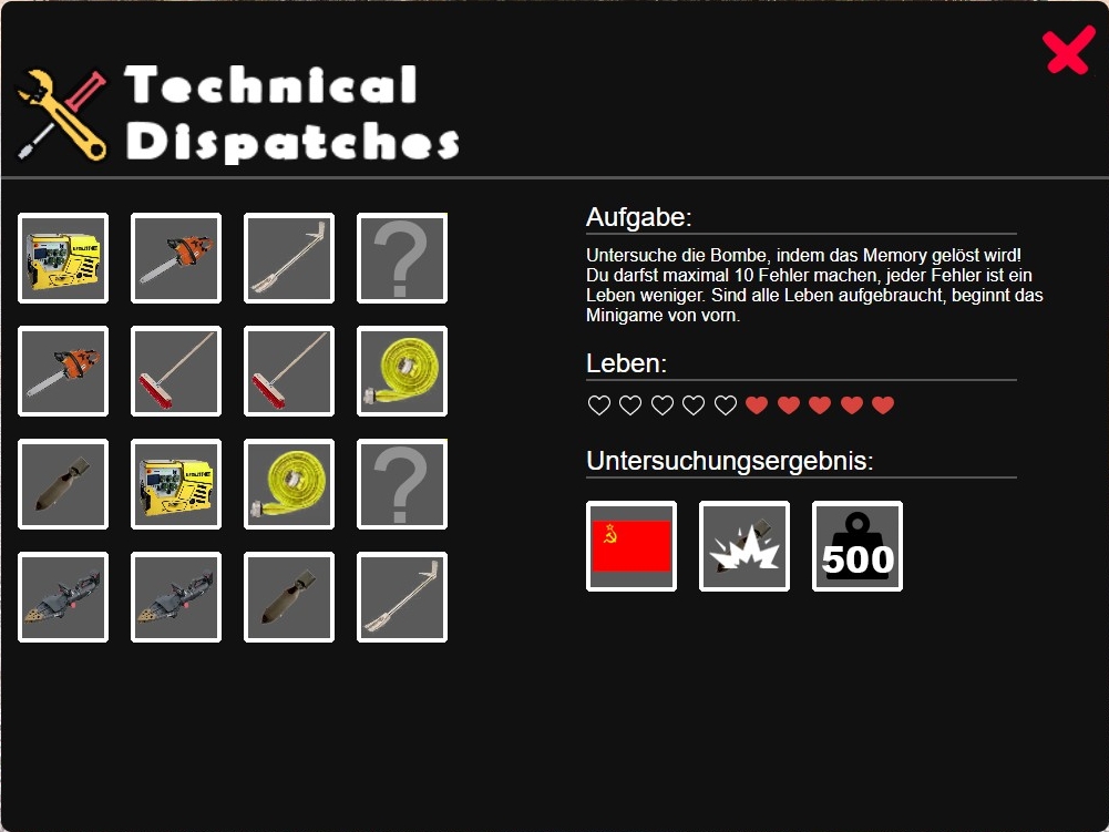 Für die initiale Untersuchung der Bombe muss ein Memory-Minigame gelöst werden. Dieses Minigame kann nicht "verloren" werden. Sind alle Leben aufgebraucht, beginnt das Memory von vorn.\